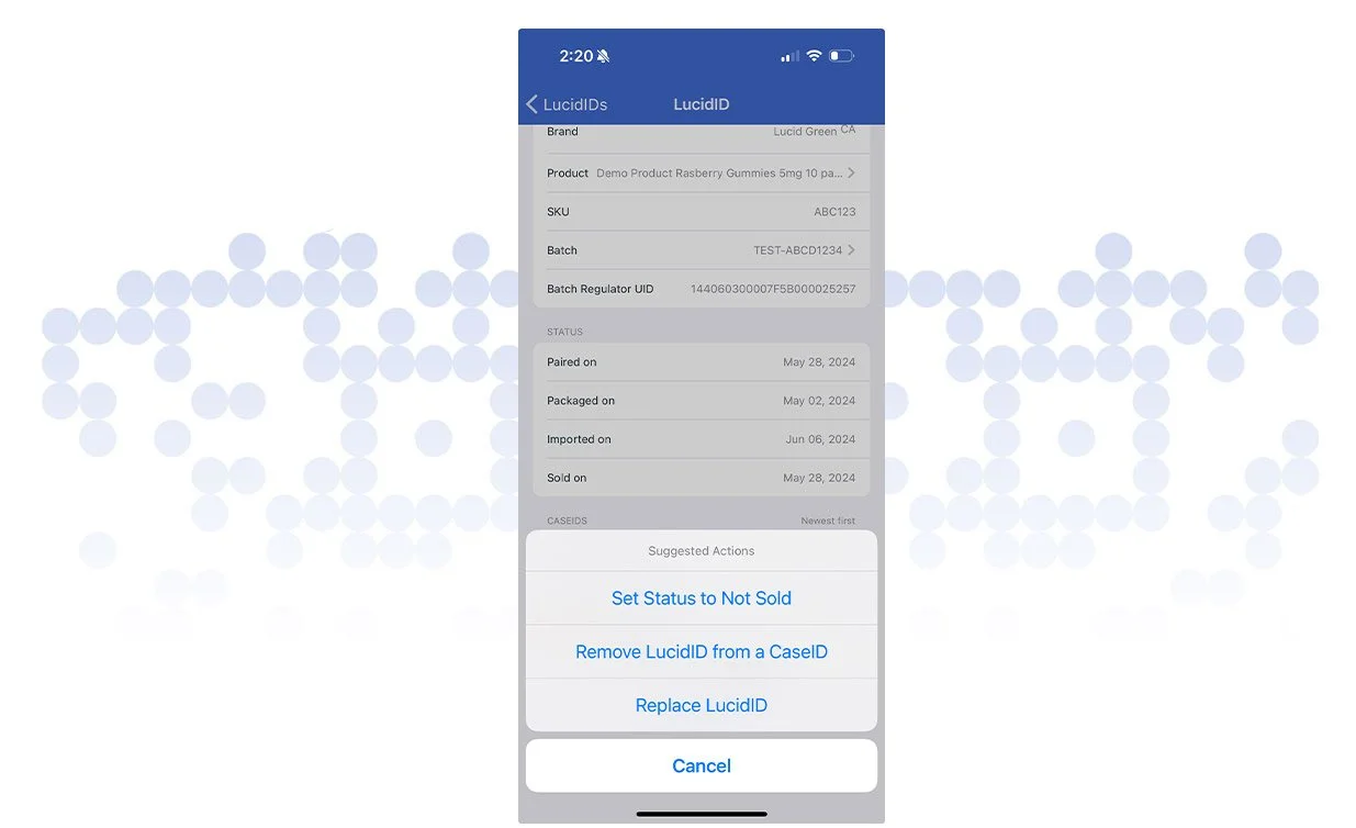 Now you can easily update the status of a LucidID that LucidRetail LITE indicates was already sold. Just QuickScan the LucidID, tap the “Suggested Actions” button at the bottom of the screen, and tap “Set Status to Not Sold”.
